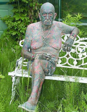 — На мені тисяча креативних малюнків, — каже. — Не маю і сантиметра на тілі без татуювання. Боді-артом покрив руки, ноги, шию, груди, спину, ступні, сідниці, голову, вуха, щоки, губи й навіть геніталії.