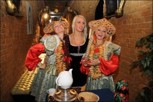 Дівчина у російському сарафані, обшитому блискітками, подає Олександрі чашку чаю і млинець з червоною ікрою.