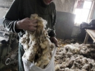 Дістає мішок вовни.