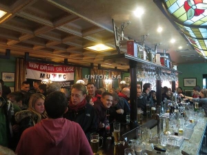 Сектор уболівальників "МЮ" розташований за одними з воріт. Тут зібралися кілька сотень глядачів. Старші чоловіки — це англійці. Хлопці й дівчата — з Росії, Грузії та України, які вболівають за "червоних дияволів".