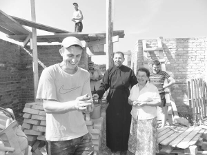 В обід ідемо на будмайданчик. Він за 1 км від будинку Кривешків. Половина храму майже збудована. Господиня несе майстрам відро черешень. Ті набирають ягоди жменями. Їдять немитими.