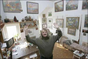 "Це я жартома називаю німбом, — художник Володимир Гарбуз, 55 років, поправляє плетений солом"яний обруч, що перехоплює волосся. — А насправді це оберіг".