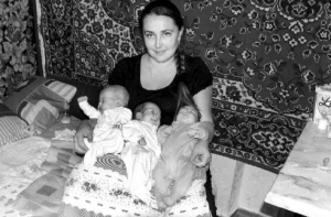 Троє малюків лежать на ліжку. Ірина не має для них колиски, спить на підлозі. Глядіти дітей допомагає матір Ганна Йосипівна, 70 років.