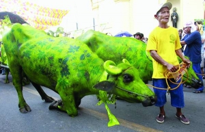 57-річний Ісідро Санкт із філіппінського міста Пулілан пофарбував своїх корів у зелений колір під час фестивалю фермерів.