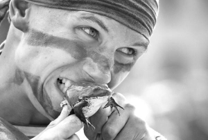 — Жаб"ячі лапи зажаримо на кострі або кинемо в бульйон. Найсмачніше в жабі — живіт. Його важко ковтнути. За смаком нагадує жуйку. Не можна нічим гидувати. Усе це м"ясо, білок, який триматиме м"язи в тонусі й втамує голод. Так десантника вчать виживати в умовах, далеких від цивілізації. Щоб не здохнути в лісі чи пустелі, треба навчитися їсти черв"яків, ящірок, тарганів. Моя дівчина, коли почула, шо я в армії їв, не схотіла зі мною цілуватися. Знав одного полковника, який черв"яки жував як канфєти. Чуваки, з якими проходив службу, взяли за традицію на зустрічі приносити слоїк із жабами. Буває, сідаємо і сорєвнуємося, хто більше з"їсть.