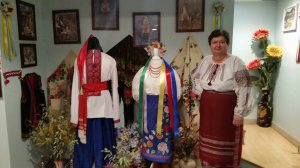 У будинках є напівпідвальні приміщення. Там облаштовують пральні, склади. Моя кімната стояла порожня. Пофарбувала стіни у блакитний колір, підлогу — в бірюзовий. Повісила килими, щоб було схоже на українську хату. Склеїла з картону піч. Оформила стіну з Шевченком, із писанками, вишитими рушниками. Поставила два манекени в українському одязі.