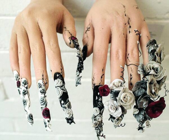 — Нігті я зробила з кілограма гелю і 300 грамів акрилової пудри, — розповідає майстер 29-річна Ізобель Бошам. — Із гелю на нігтьових пластинках формувала троянди. Покрила їх чорним і червоним лаками. Нігті важкі. З таким манікюром можна сходити на вечірку або весілля. Але на ніч краще знімати. Від нього можуть боліти пальці.