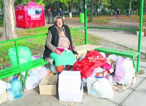 — Она здесь где-то в августе появилась. До этого месяц-два на трамвайной остановке сидела — с другой стороны рынка. А потом сюда перебралась, свалку развела. У нее там крысы скоро заведутся. А как ее зовут, я и не знаю, — каже продавщиця років 40, з коротким волоссям, у фартуху. — Вы за нее не переживайте — у нее деньги есть. Попрошайничать она на ту сторону базара ходит, на трамвайную остановку. А здесь только ест и спит, спит и ест. Ей баночки с едой и волонтеры несут, и из церкви, и местные ее жалеют. Она всем говорит, что ее из квартиры выгнали, что ей деваться некуда. А на самом деле у нее дом есть где-то в селе в Винницкой области — сама рассказывала. Мы спрашиваем: "Так чего же ты туда не едешь — там же прокормиться можно, огород, курочку какую-нибудь держать?". Она: "Ага, там работать надо, а тут еды — во!", — продавщиця показує руками, скільки.