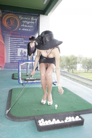 Розмахується ключкою. М"ячик долітає до позначки 300 м. Анні аплодує модель Елеонора Масалаб, 21 рік. Вона у короткій чорній сукні та крислатому капелюсі. Присідає, щоби покласти м"ячик на підставку. З-під сукні видно рожеві трусики. Осмикує плаття рукою. Пославська показує їй, як правильно тримати ключку.