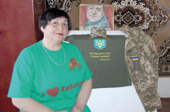 Сідаємо на стільці в кімнаті. Під стіною — стіл із грамотами, світлинами Романа і його портретом, намальованим акварельними фарбами. Лежить військова форма та футболка з написом "Господь дасть силу своєму народові".