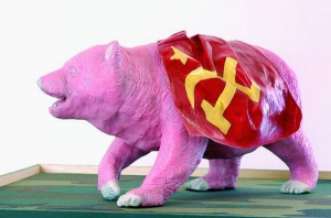 Ведмедя під радянським прапором зробив італійський скульптор Мауріціо Савіні з жуйки. Цей матеріал використовує у своїх роботах останні 15 років.