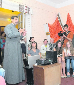 Священик переодягається із чорної в сіру рясу. Із парафіянами спускається на перший поверх. Там є кімната на 12 кв. м із розставленими лавками і диваном. На стіні натягнутий екран. Біля дверей стоїть проектор із ноутбуком. У кімнаті є український прапор і вишитий рушник.