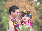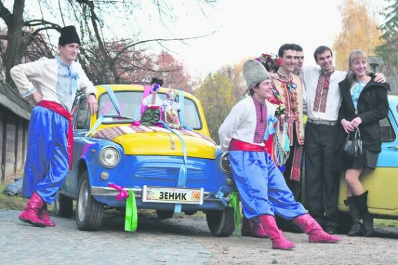 Наречені 29-річний Зеновій та 24-річна Юлія приїжджають двома горбатими "запорожцями". Авто прикрашені стрічками та ляльками-мотанками. Наречені у вишиванках. Молода у вінку зі штучних ромашок і маків. За ними йдуть дружби у синіх шароварах та червоних чоботях і дружки у темно-зелених спідницях до колін.
