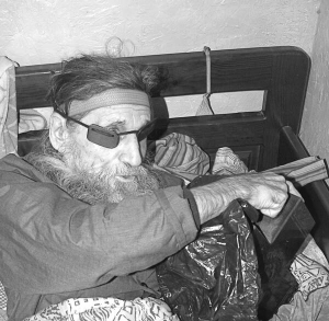 — Боже спасі, шо ти таке говориш, перехрестися, — заспокоює сестра сліпого. Виходимо з кімнати. — Добре, що хоть не дуже матерився словами поганими. Він жив 10 років у дерев'яній будці на полі — пес, кіт від нього пішли через холод. А він далі терпів. Осліп, то по шнурку ходив до якогось там крана по воду. Родом із Владивостока. Дізнався, що його батько десь у Польщі похований — ішов туди пішки, але в Тернополі спинився. Якась добра жінка йому консерви іноді приносила.