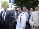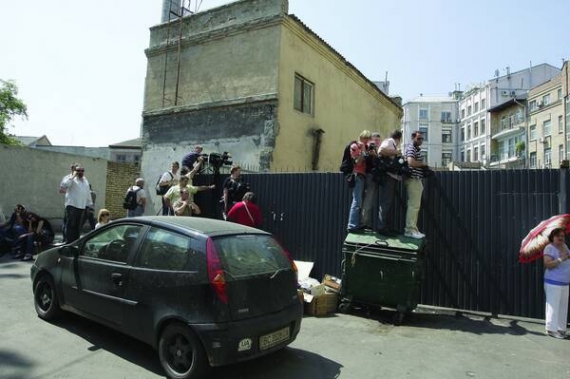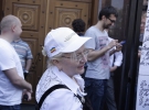 На вулиці її чекають близько 30 постійних прихильників. Вони ходять на кожен її допит. Коли бачать "газелі", біжать до заднього двору. Зупиняються перед 3-метровим залізним парканом.