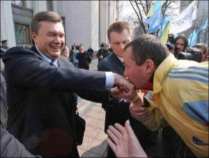 — Янукович — наш президент! — кричать жіночки, а якийсь чоловік крізь стрій охоронців дотягується до прем"єра й цілує йому руку.