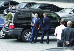 За 5 хв. до засідання охоронці просять усіх пройти до зали. Останнім заходить прем"єр 62-річний Микола Азаров.