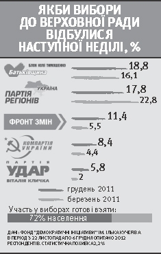 — По рейтингу влади б'є і справа Тимошенко, — каже експерт. — Доки тривав суд, популярність "Батьківщини" не зростала. Але вже після вироку екс-прем'єру рейтинг її партії почав зростати десь по відсотку кожен місяць. Якщо далі ситуація залишатиметься невирішеною і влада засудить Тимошенко, це мобілізує людей. До Тимошенко зараз підтягуються ті, хто від неї колись пішов. Наростання її підтримки може відбуватися і за рахунок тих, хто виступає просто проти влади. Поки ці люди більше схиляються до "Фронту змін" Арсенія Яценюка. Але за правильно проведеної кампанії вони можуть віддати голоси за "Батьківщину". У мене великі сумніви, що так і відбудеться, бо люди на місцях не можуть сприйняти лідерство в "Батьківщині" Олександра Турчинова та його команди. Для більшості БЮТ — лише Тимошенко, і тільки вона.