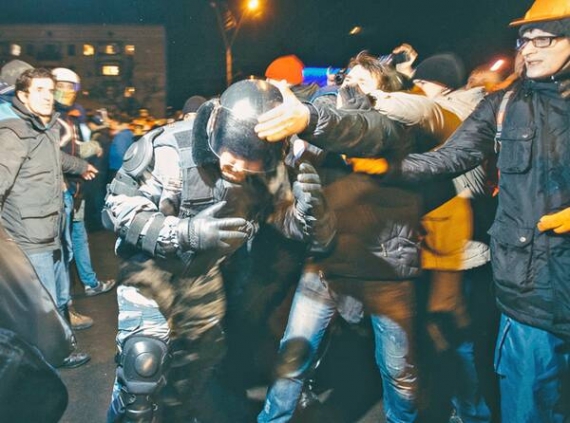 — Ми просили їх показати документи. Покажи — і йди собі. По закону повинні це зробити, але закон їм пофіг, — каже 24 річний Микита Гладков, стоїть біля пораненого. — Юрій Луценко з жінкою (дружина екс-міністра, Ірина Луценко — народний депутат від "Батьківщини". — "ГПУ") намагалися з ними домовитись, говорили більше години. Їм і на депутатів начхати. Провокатори кричали "перевертай автобус". А "Беркут" почав бити кийками по головах. Страшно. Стоїш, а поряд людину гамселять.