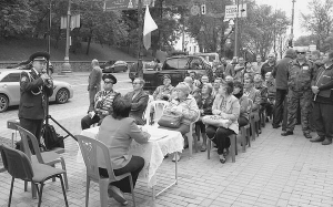 — Із дня проголошення України як незалежної держави керівники центральних та місцевих органів виконавчої влади ігнорували прямі норми Конституції. Там зазначено, що кожен має право на житло, — каже у мікрофон голова "Всеукраїнської спілки безквартирних офіцерів" 57-річний В'ячеслав Осіпенко. Бере з пластикового столу аркуш, читає. — Бездіяльність влади призвела до зростання черги на житло для колишніх військовослужбовців. На 1 вересня вона становить понад 100 тисяч сімей.