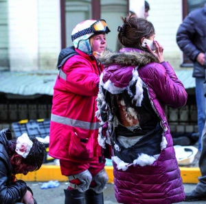 Біля місця протистояння збираються до чотирьох тисяч людей. Під'їжджають дві "швидких". Є поранені. До лікарів виводять фотографа Гліба Гараніча. У нього на грудях розірвалася граната та контузила його. Він був у бронежилеті. Приводять літнього чоловіка із травмою ноги. Коли надають допомогу, в заднє скло "швидкої" кілька разів влучають кулі й залишають тріщини. Люди ховаються за автомобілями — міліціонери стріляють по них.