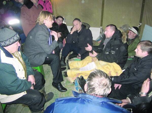 — Вызывайте Азарова на партсобрание, вы все "регионалы"! — не вгаває Гончаров. — Передайте, что отсюда не уйдем. И еще — что сносить городок не советуем. Может случиться непоправимое. Энное количество человек готово в случае силового захвата палаточного городка совершить самосожжение.
