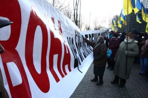 Мітингувальники гріються, жбурляючи одне в одного шматочками льоду. Старші тупцюють на морозі під музику, що лунає з динаміків. Більшість — літні люди, переважно пенсіонери зі столичного Деснянського району. Говорити відмовляються, відвертаються й хитають головами: