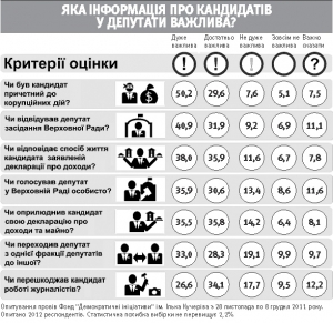 — Критерій номер один для виборців — чи не був депутат замішаний у корупційних діях, — каже 60-річна Ірина Бекешкіна, директор Фонду "Демократичні ініціативи". Опитування провели за участі цього Фонду. — Корупційні дії кандидатів буде складно досліджувати. Можна посилатися лише на відкриті джерела, і то, якщо депутат цих фактів не спростував.