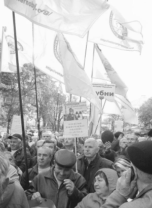 Біля Юрія Черв'яка у середу вранці збираються близько 200 мітингувальників із прапорами Всеукраїнського об'єднання ветеранів Чорнобиля. У декого транспаранти: "Нам нельзя выбирать между покупкой лекарств и хлеба", "Ликвидация эвакуированного населения". На паркан вішають плакат: "Требуем выполнять статьи 50 и 54 чернобыльского закона!". Поряд по периметру стоять 18 міліціонерів. Мовчки спостерігають.