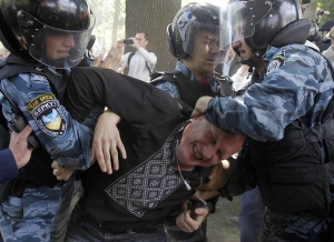 — Ганьба! Міліція, не виконуй злочинних наказів! Падлюки, що ви робите? — кричать люди.