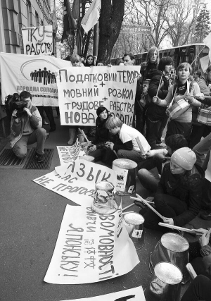 Поряд із нею із 20 людей б'ють палицями по порожніх алюмінієвих відрах. Скандують: "Ні — другій державній мові!". Біля них лежать плакати: "Боріться з кризою, а не з мовою", "Хочеш двомовність — вивчи японську".
