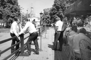 У приміщенні страшенна задуха. Люди обмахуються блокнотами, деякі роззуваються, змочують руки та шию мінералкою, виходять на балкон подихати.