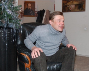 43-річний Сергій Терьохін у коричневому светрі з рубцями, стильно зашитими назовні, у вельветових штанах та замшевих півчобітках. Сідає в дуже низьке чорне м"яке шкіряне крісло. Його коліна опиняються на рівні очей. Терьохін зсувається на край і кладе лікті на коліна.