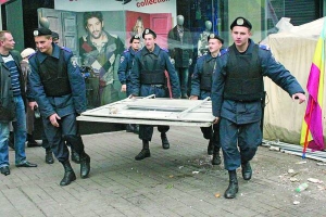 За 15 хв. підходять восьмеро міліціонерів. Мовчки складають паркан із написом "Заповідь першокласнику. Щоб на Банковій сидіти, треба змалку йти в бандіти". Правоохоронці виносять секції.