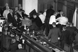 "Регіонали" звільняють президію від "бютівців". Ельбрус Тедеєв і Дмитро Саламатін висмикують їх по одному з натовпу та передають із рук у руки Владиславу Забарському та лідеру фракції "Регіонів" Олександру Єфремову. Ті виштовхують їх у двері. Не чіпають тих, які виходять самі. Коли всіх витурили, "регіонали" збираються у президії та сміються, плескають один одного по руках.