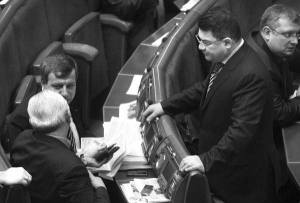 "Регіонали" ходять залою, передають один одному роздруківки з результатами голосувань по областях під час виборів президента. У кулуарах вітають один одного з перемогою Віктора Януковича.