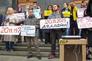 Люди гуртуються на сходах Офісу. На плакатах написи: "Що після 20.11.19?", "Справи Майдану — екзамен на гідність", "Не злий Майдан". На крайньому: "Чи то влада дурна, чи нас тримає за дурнів".