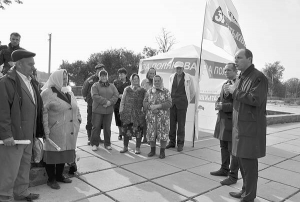 — Багатьох людей у селі пенсійна реформа, яку готували люди Януковича, фактично позбавляє можливості взагалі дочекатися пенсії. Люди в селі часто живуть з того, що торгують молоком чи грибами або яблуками. В селі здобути трудовий стаж і запис у трудову книжку надзвичайно складно. В нас питають, чи відмінить Об'єднана опозиція цю пенсійну реформу, якою Янукович просто познущався над пенсіонерами. Ми гарантуємо, що відмінимо її. І ми презентуємо людям наше бачення пенсійної реформи та обіцяємо, що піднімемо мінімальну пенсію як мінімум на 234 гривні. І зробимо так, щоб пенсія була однаковою для всіх. Незалежно від того чи ти колишній міністр, чи депутат, чи ти селянин, чи працівник на заводі.