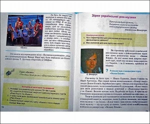 У підручнику йдеться про такі всесвітньо відомі гурти, як "Бітлз", "Квін", "Пінк Флойд". У розділі "Зірки української рок-музики" є історія створення гурту "Океан Ельзи" й розміщено фото його лідера Святослава Вакарчука. Про інші не менш відомі рок-групи України згадки немає.