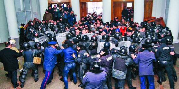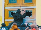 Активісти починають штурмувати двері, їх стримує міліція. У бік правоохоронців летять вибухові пакети й димові шашки. Чоловіки йдуть у наступ на силовиків із гумовими кийками та газовими балончиками, приховують обличчя за балаклавами.