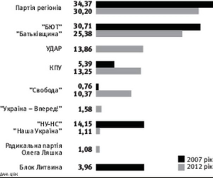 На виборах до парламенту 2007 року тодішній 3-відсотковий прохідний бар'єр подолали п'ять політичних сил: Партія регіонів, БЮТ, "Наша Україна — Народна самооборона", Компартія та Блок Литвина. Цього року бар'єр збільшили до 5%. У Верховній Раді потрапляють п'ять партій, серед них дві нові: "УДАР Віталія Кличка" та "Свобода". "НУ-НС" набрав трохи більше 1%, а "литвинівці" балотувалися тільки в мажоритарних округах.