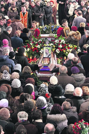 Церква переповнена, люди стоять за воротами. Прийшли матері з немовлятами, люди на милицях. На руках та сумках мають синьо-жовті стрічки. На катафалку повісили портрет із чорною стрічкою та написом "Вбитий владою".