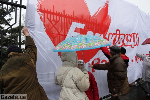 Бабусям Тимошенко сніг не завадив обклеювати серцями паркан під судом