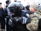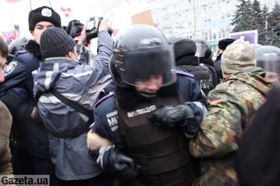 Вони також тримали плакат: "Янукович - кат України", скандували гасла "Банду геть!", "Донецьку мафію на нари".