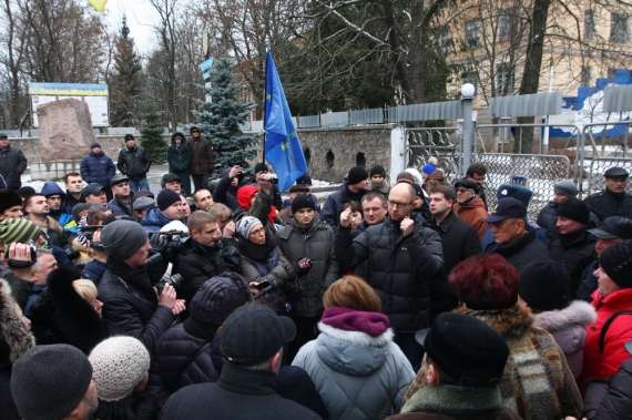 У цей час біля КПП до коледжу зібралися дві сотні людей. Під'їзд від дороги заблоковано легковиками і мікроавтобусами. Арсеній Яценюк говорить у мікрофон про МВС-ників: