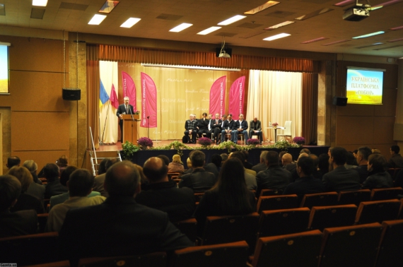 Близько сотні людей розміщаються у залі приміщенні "Майстер класу", що неподалік Києво-Печерської Лаври. За декілька хвилин тут має розпочатися з'їзд партії Українська платформа "Собор". Напередодні старту передвиборної кампанії в партії пообіцяли знятися з перегонів, якщо до 14 жовтня виявиться, що політична сила не долає 5% бар'єр.