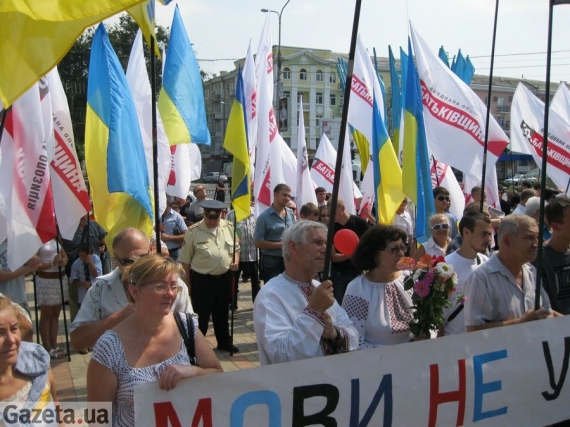 Під прапорами КУНу, "Свободи", "Народного руху", "Батьківщини" зібралися понад 400 людей. У багатьох були на одязі наліпки "Я проти Януковича".