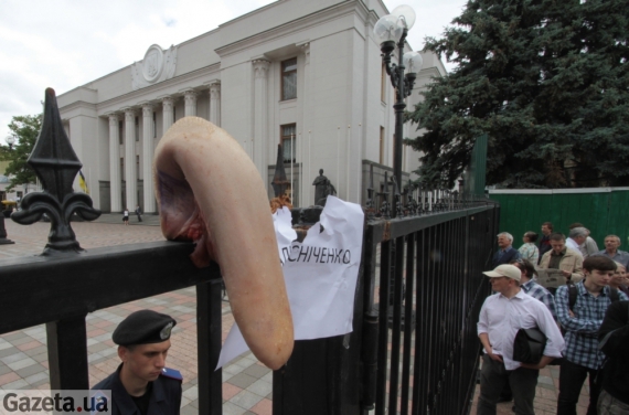 Коли Колесніченко представляв законопроект, опозиція блокувала трибуну ВР. Депутати провалили зняття з розгляду всіх мовних законопроектів, тому що знаходились біля парламентської трибуни, а не на своїх робочих місцях. "Нунсівка" Лілія Григорович, яка стояла серед блокувальників, тримала ікону, на якій зображена Божа Матір з маленьким Ісусом.