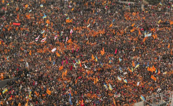 Після оголошення результатів на Майдані зібралося від 100 до 500 тис. людей, які не погоджувались із рішенням ЦВК. Влада вивела на вулиці 500 спецпризначенців "Беркуту". Протестувальники влаштували наметове містечко. Символом боротьби стала помаранчева стрічка.