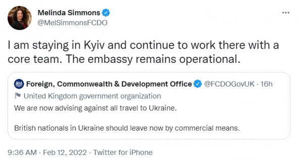 Посол Британії в Україні Мелінда Сіммонс заявила, що продовжить роботу в Києві та нікуди не поїде.